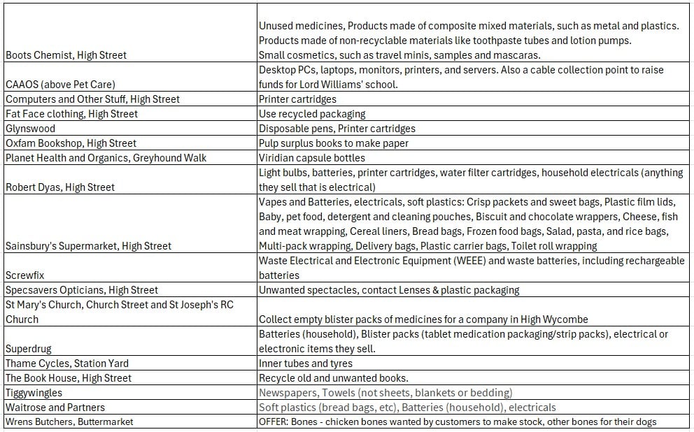 Below you can see a list of places in Thame where you can recycle items that may not be recyclable from the kerbside. If you know of any others please let us know!