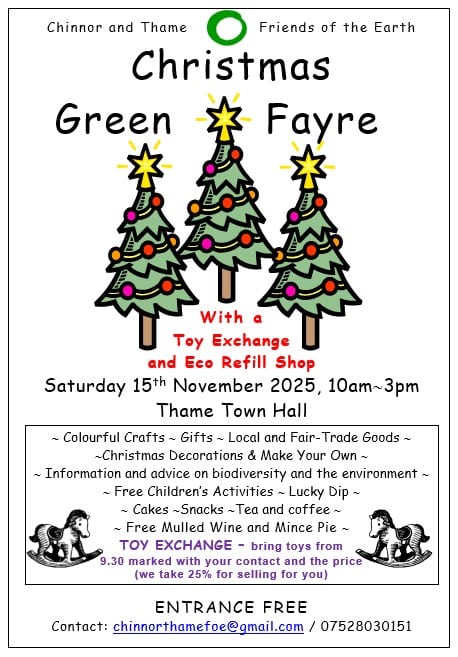 Chinnor and Thame Friends of the Earth will be delighted to welcome you with a free glass of mulled wine and mince pie at our Christmas Green Fayre. Crafts, Gifts, Local and Fair-Trade Goods. Christmas Decorations and Make Your Own. Free Children’s Activities, Cake, Snacks, Tea and Coffee,